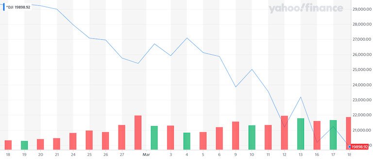 Not only have the most recent drops followed March 12’s 10% decimation of the Dow Jones, but the falls from one-month highs similarly coincided with another bad day for stock markets. For the five cryptos above, and for basically every other coin, these one-month highs fell on or just after February 18, the day when Apple issued a coronavirus warning that caused markets to slide.