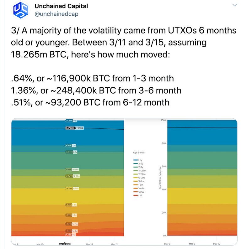 Put more simply, during the four days between March 11 and March 15, 458,500 bitcoins were sold that had been minted within the past year. By contrast, only 26,000 bitcoins were sold that had been minted between 18 and 24 months ago, 9,132 bitcoins that were between two and three years old, and only 3650 bitcoins that were at least five years old.