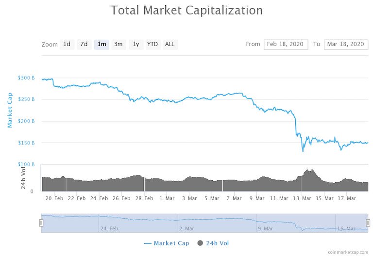 As of writing, Bitcoin is priced at $5,212, down 48.7% from its one-month high of $10,172, and down 34.2% from its one-week high of $7,925 (on March 12). Much of this decline has therefore happened in the past week, with its drop on March 12 coinciding with the Dow Jones falling by 10% on the stock market’s worst day since 1987.